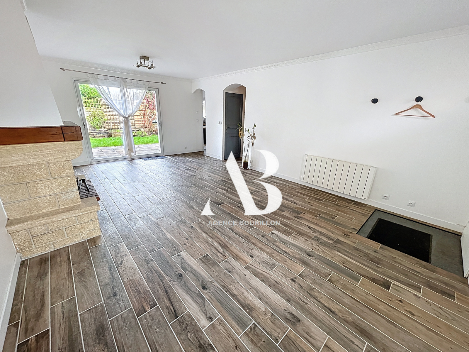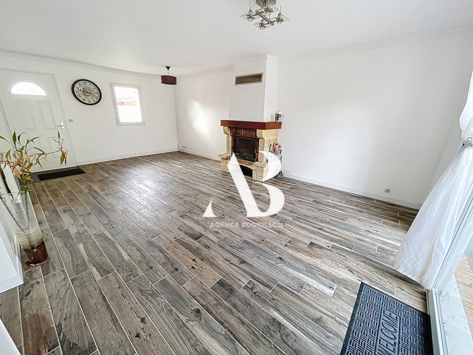 Vaste séjour avec cheminée insert et répartiteur de chaleur à côté d'une cuisine aménagée et équipée idéalement pensée.